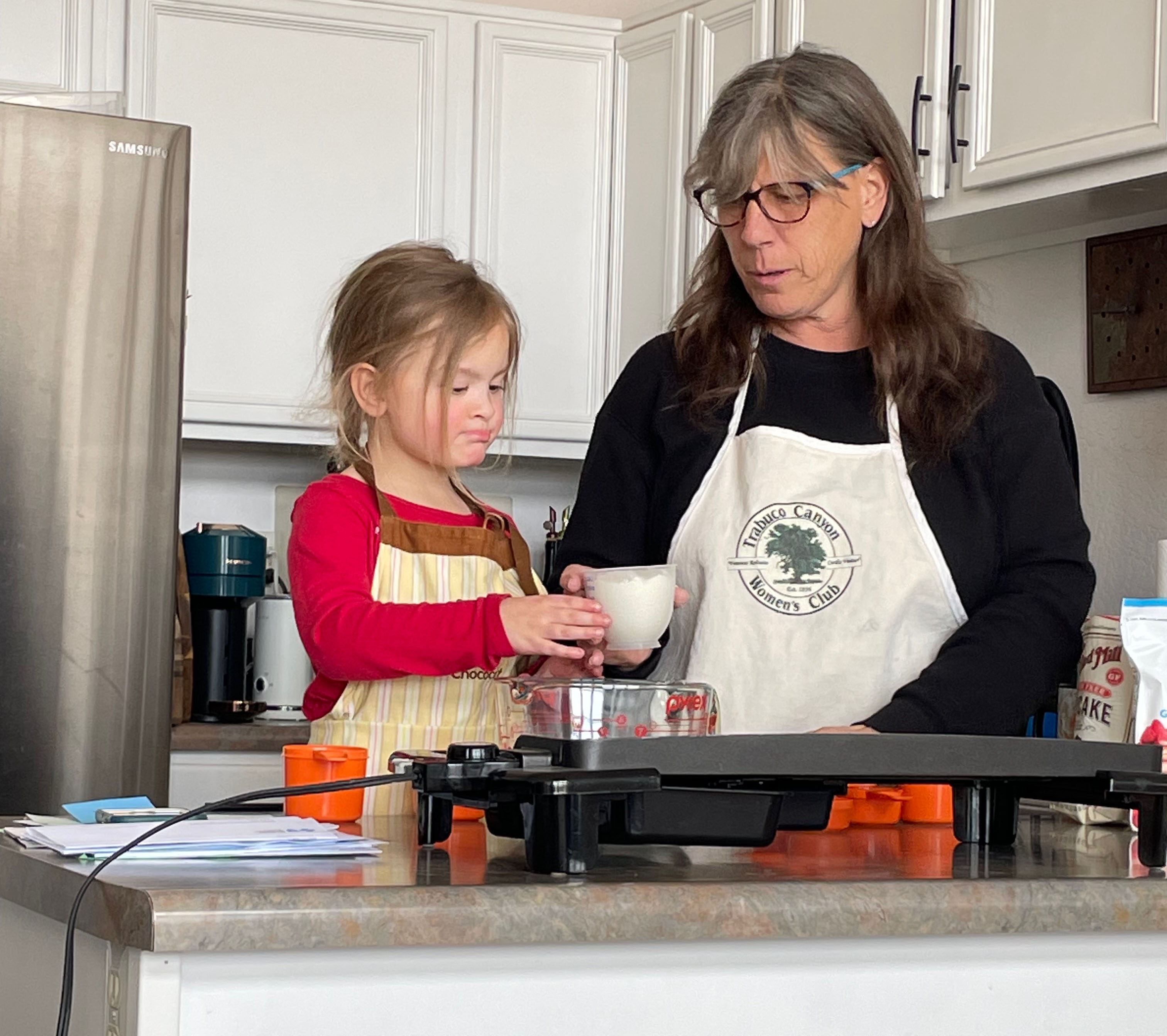 Much of the activities are outside with dirt and animals, but she also enjoys helping Nana in the kitchen.