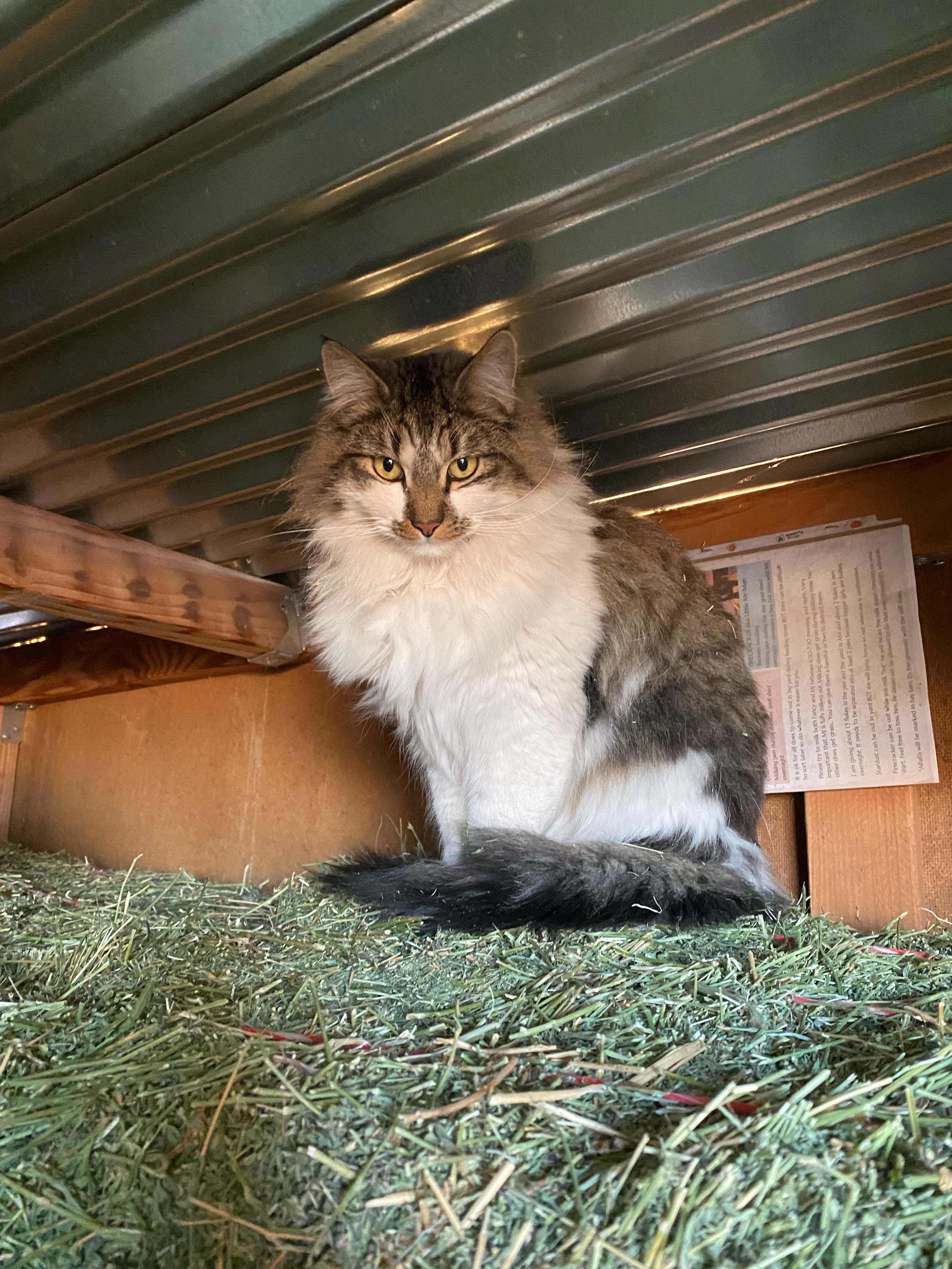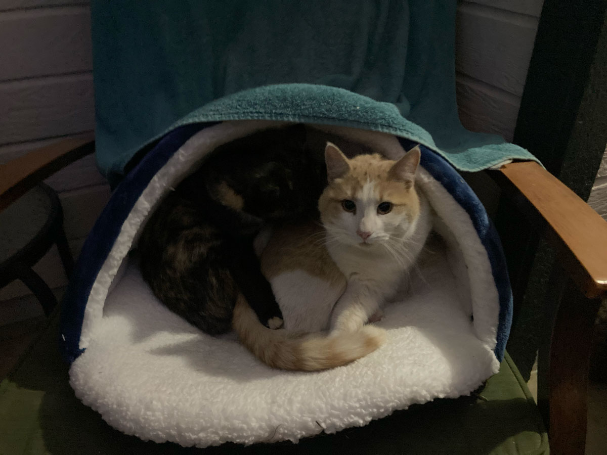 Some sleep in the hay barn. These two sleep on the front porch in a fleece-lined kitty igloo.