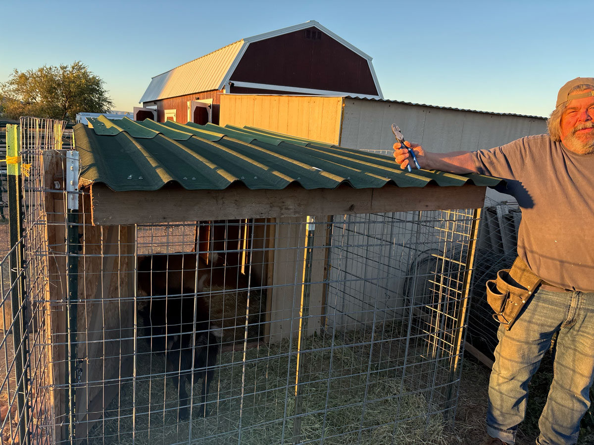 It seemed a little cruel to lock them in a comfy box with straw bedding so Don added a covered patio. They're not animals you know.