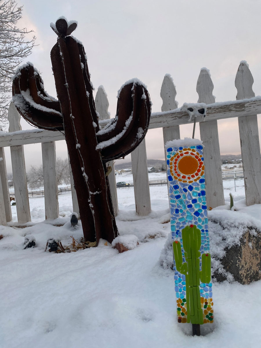 The colors of our sheet metal cactus and our glass art really pop against the white background.